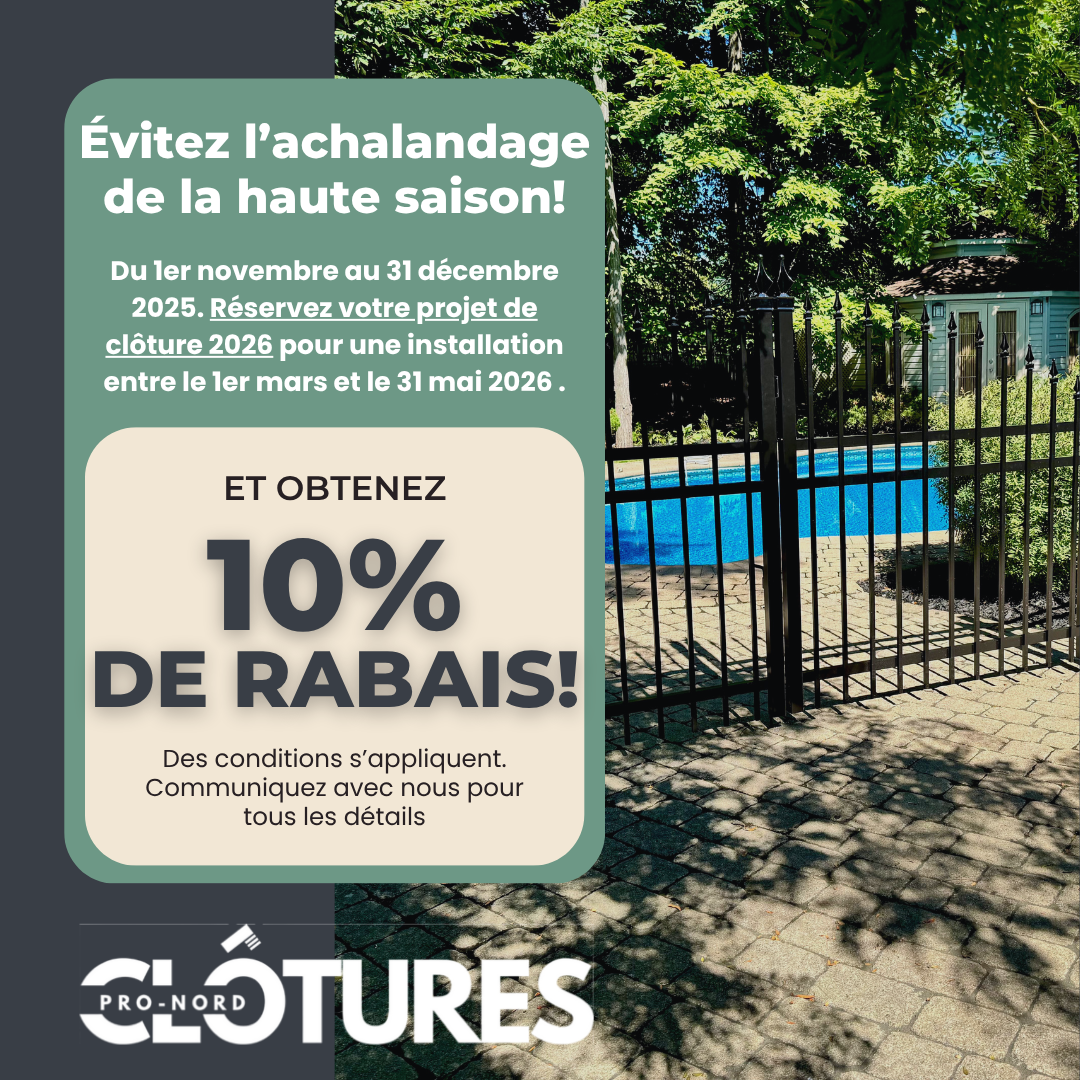 Du 1er novembre au 31 décembre 2025, réservez votre projet de clôture 2026 avec Pro-Nord Clôture et profitez de 10 % de rabais.